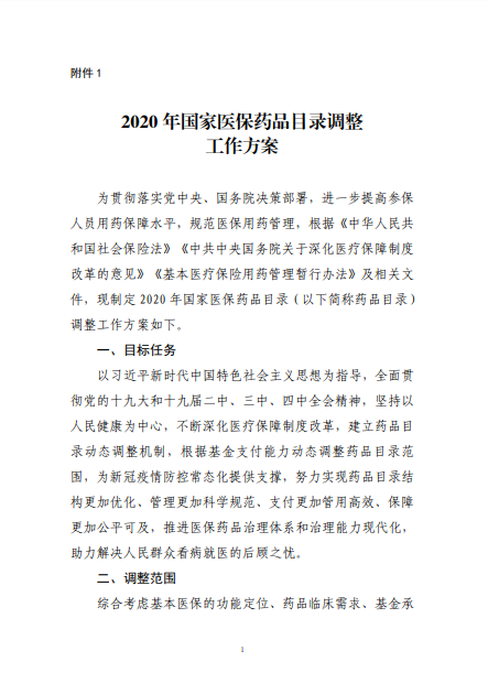 國家醫(yī)療保障局關于公布《2020年國家醫(yī)保藥品目錄調整工作方案》和 《2020年國家 醫(yī)保藥品目錄調整申報指南》的公告