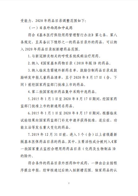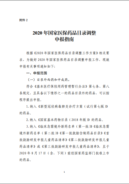 2020年8月3日-10日,國家醫(yī)療保障局就《2020年國家醫(yī)保藥品目錄調整工作方案(征求意見稿)》向社會公開征求了意見。8月17日,《2020年國家醫(yī)保藥品目錄調整工作方案》和《2020年國家醫(yī)保藥品目錄調整申報指南》正式公布。